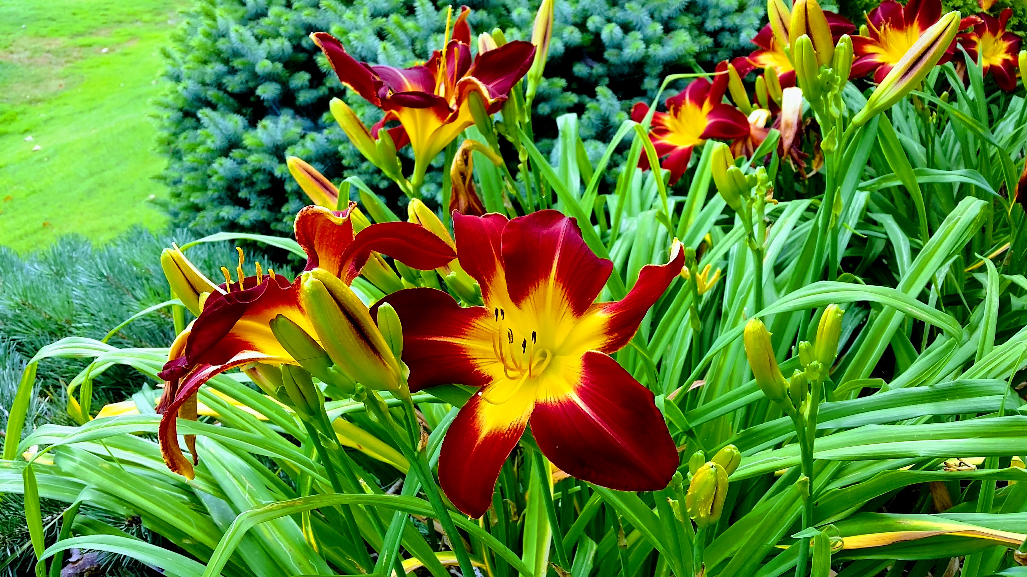 Rich maroon daylilies, edged in golden throats, bring bold contrast to sunny banks and illustrate how we build drama with reliable repeat bloomers.