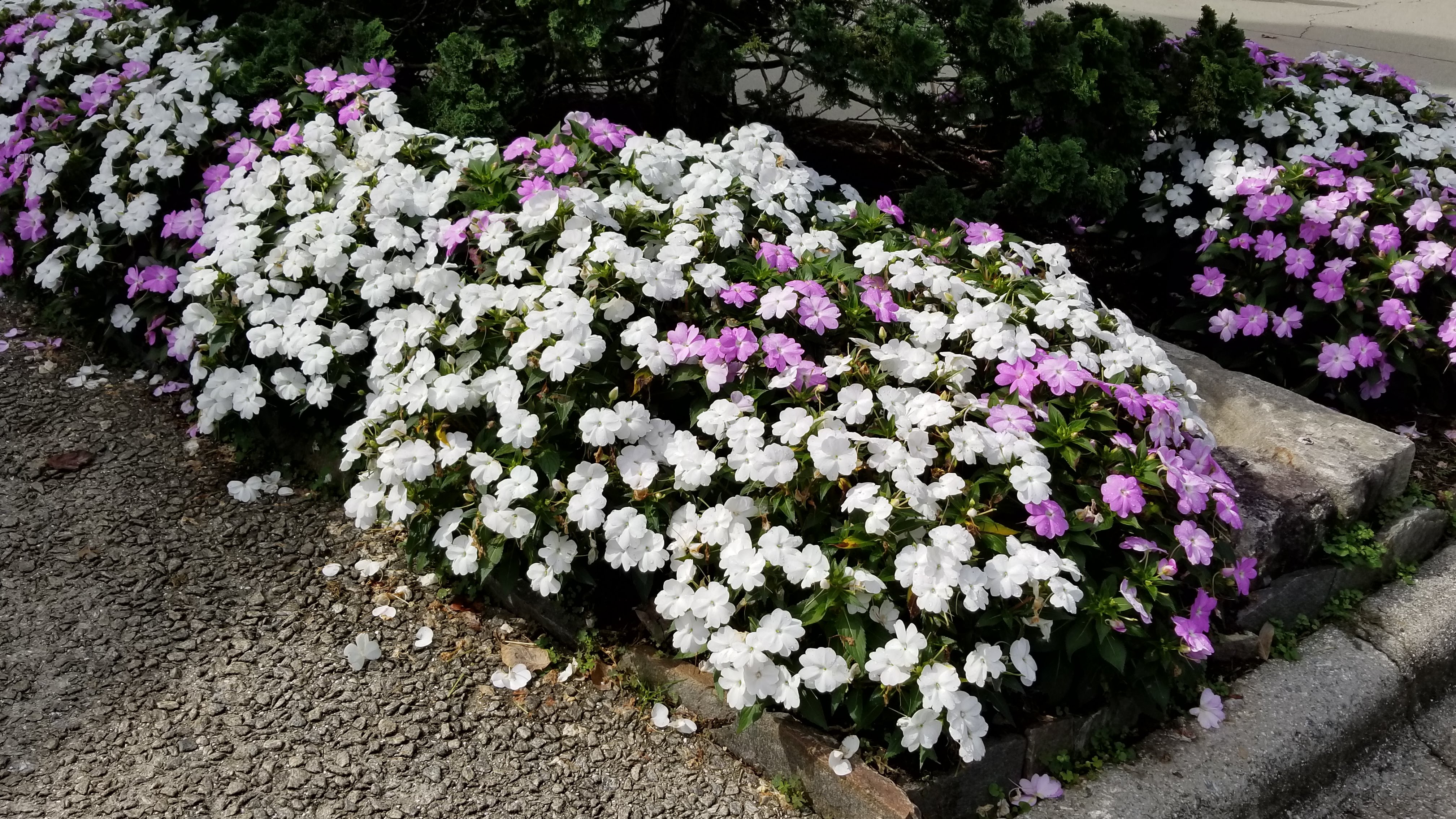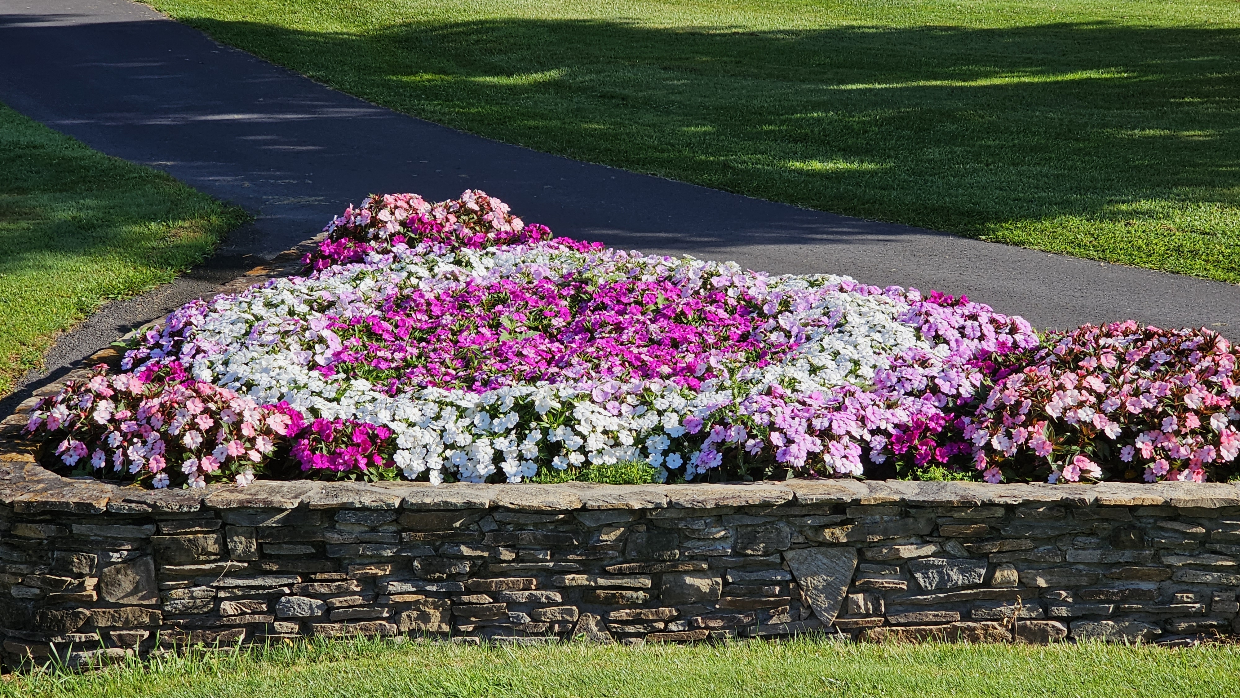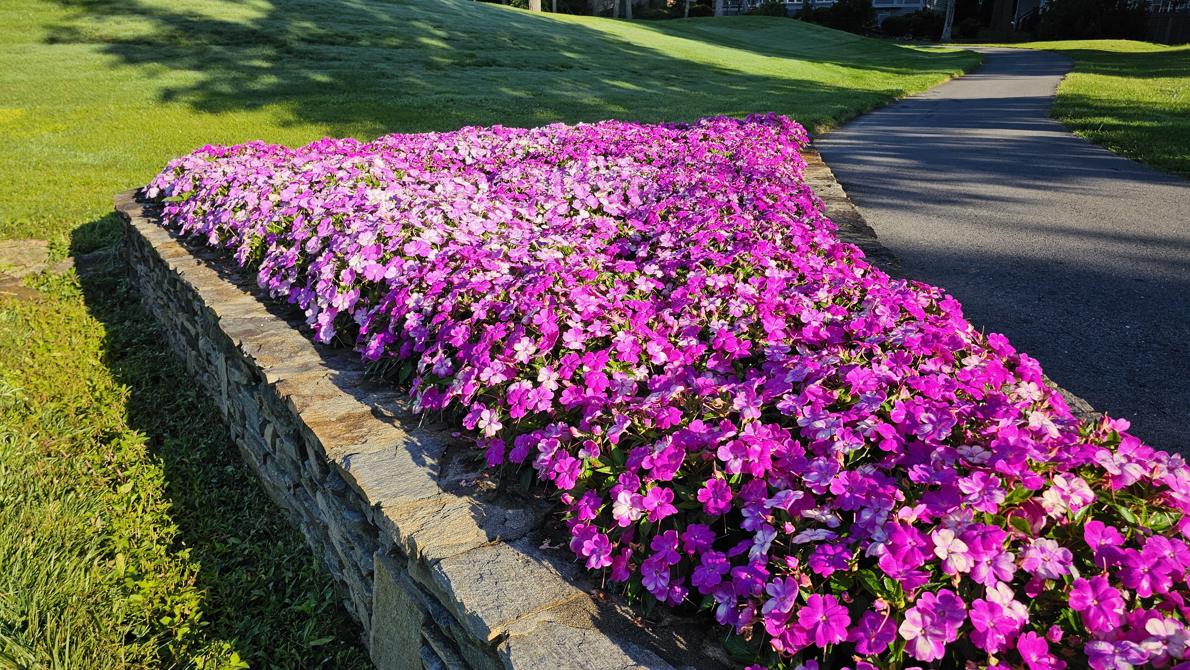 Massed impatiens in layered pinks flow like water over stone terraces, an example of how we achieve uniform color in challenging exposures.