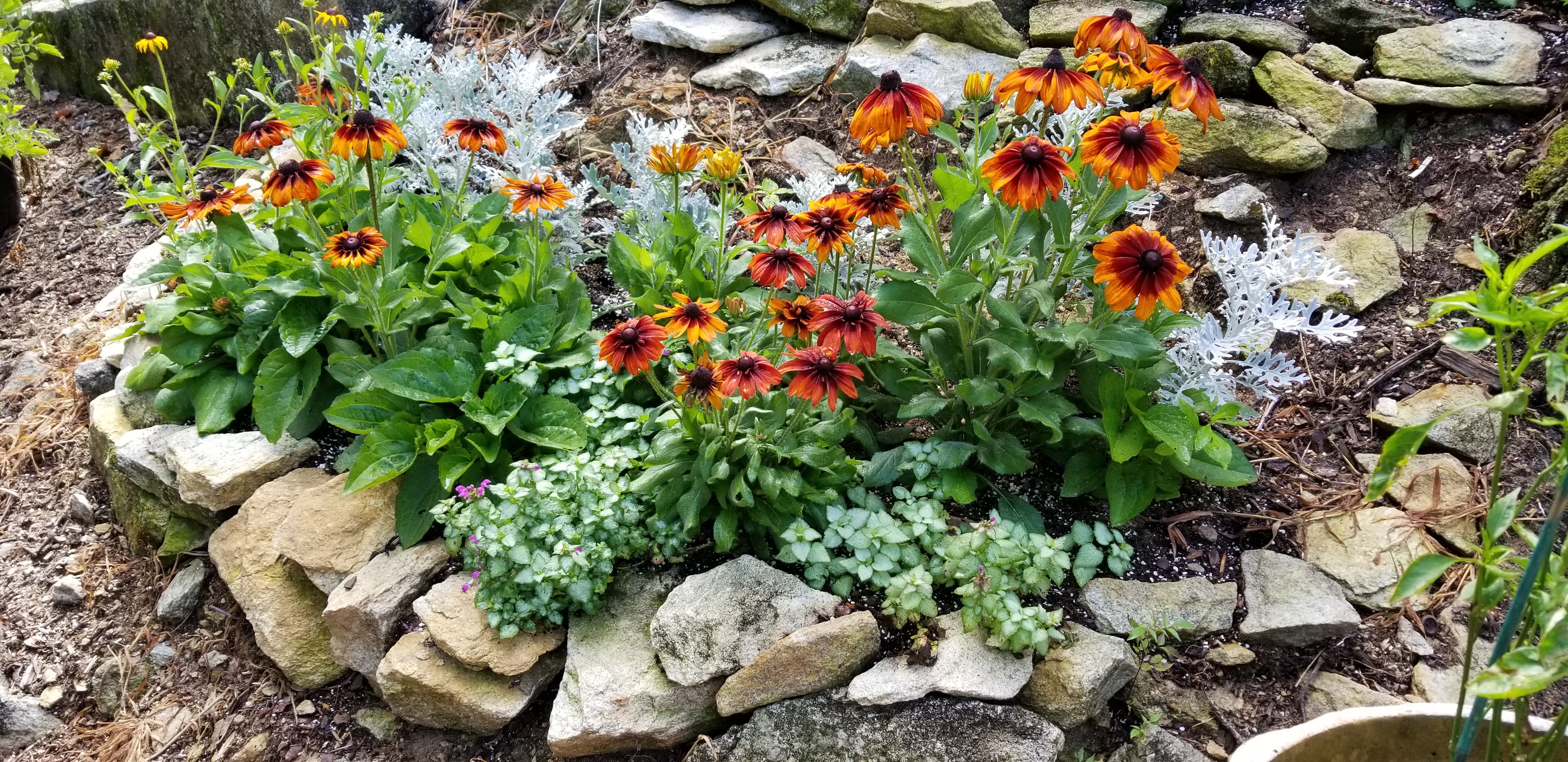 A petite bed of Rudbeckia, Dusty Miller, and Lamium proves that texture swaps—in silver, chartreuse, and amber—can make any foundation planting sing.