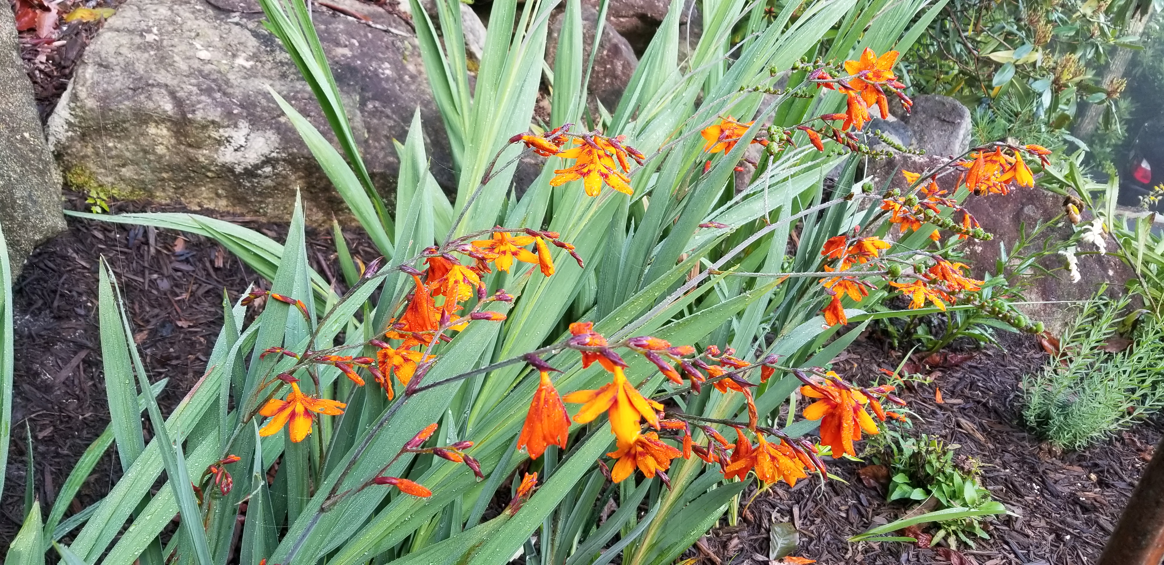 Crocosmia ‘Lucifer’ arcs over river rock in flaming orange-red, a favorite accent when we want kinetic movement in tight perennial spaces.