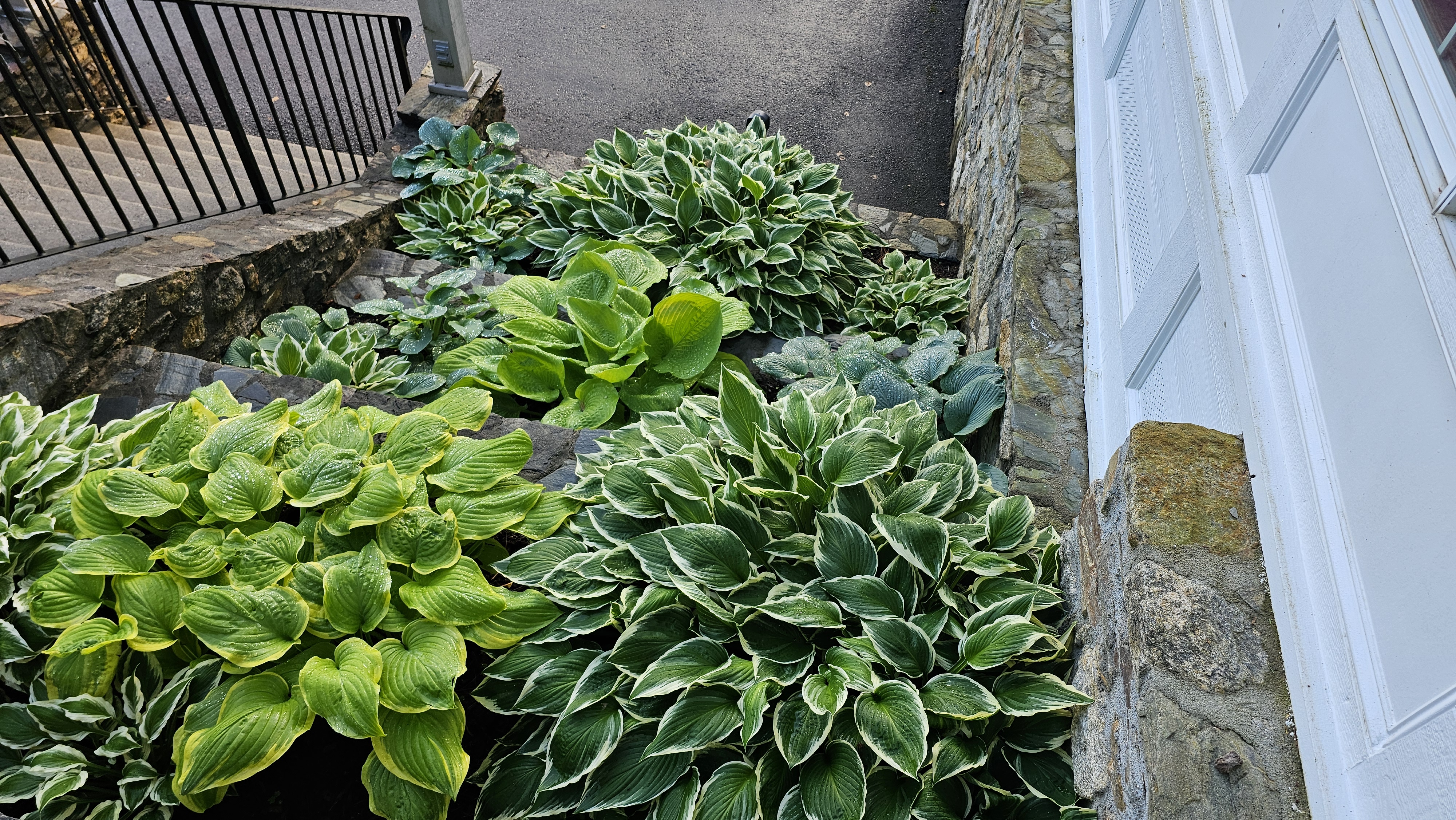 Chartreuse, blue, and variegated hostas stair-step down a stone walk, illustrating our dedication to layered shade structure.