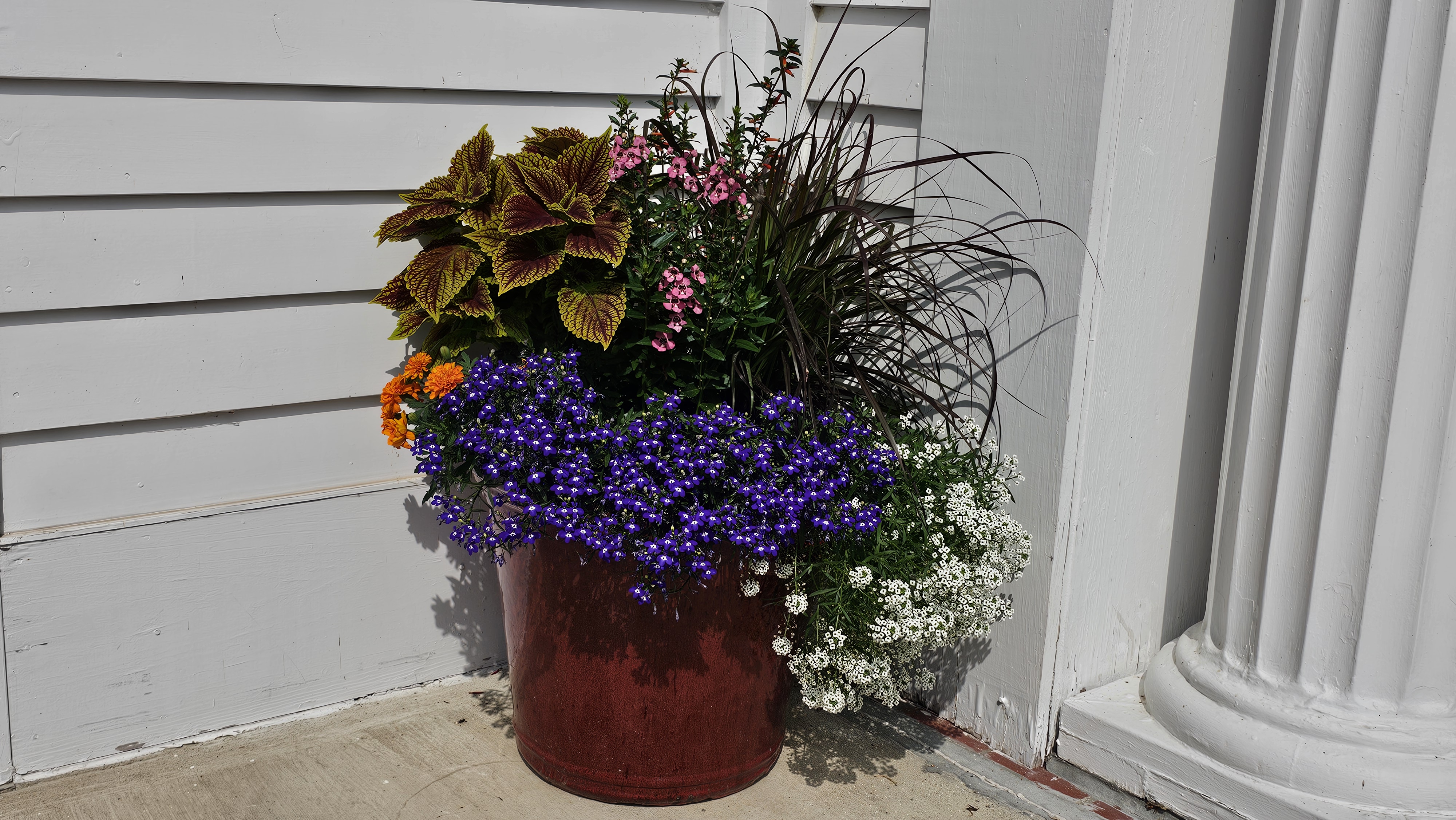 Coleus, angelonia, purple fountain grass, and marigolds join forces in a terracotta vessel to give entryways an all-angle showpiece.
